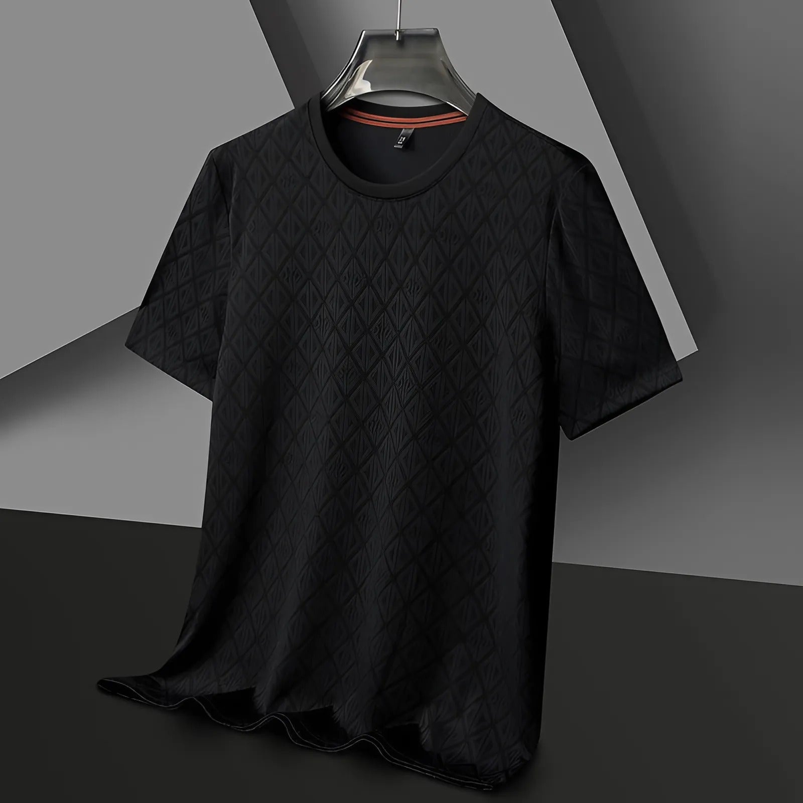 Step into effortless sophistication with the Virelli Tee — where breathable luxury meets bold design. Crafted from lightweight ice silk fabric, it delivers a cool, smooth touch and a refined geometric pattern that stands out without trying too hard. Perfectly tailored for warm days and sleek summer nights.